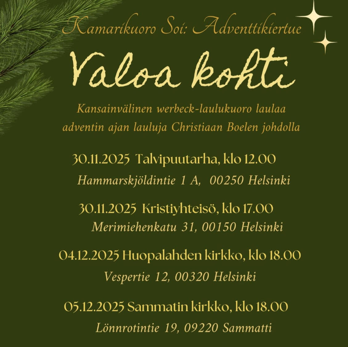 konsertoi tänä vuonna 30 laulajan voimin ajalla 30.11. - 5.12.2025 Etelä-Suomen alueella. Kiertueella lauletaan adventin ajan lauluja eri aikakausilta useilla eri kielillä. Laulajia saamme tänäkin